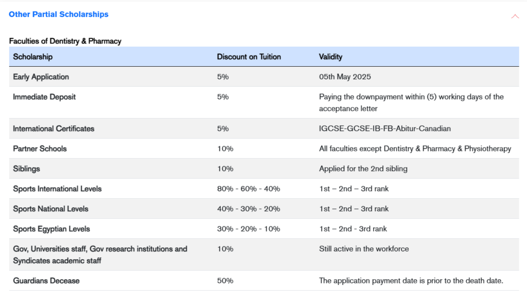 The partial scholarships criteria are offered in addition to the academic scholarships categories (A*-A-B-C) with a maximum of (20%) for all faculties except for Dentistry which is up to (15%). Exceptions apply for Sports achievements and deceased Guardian.