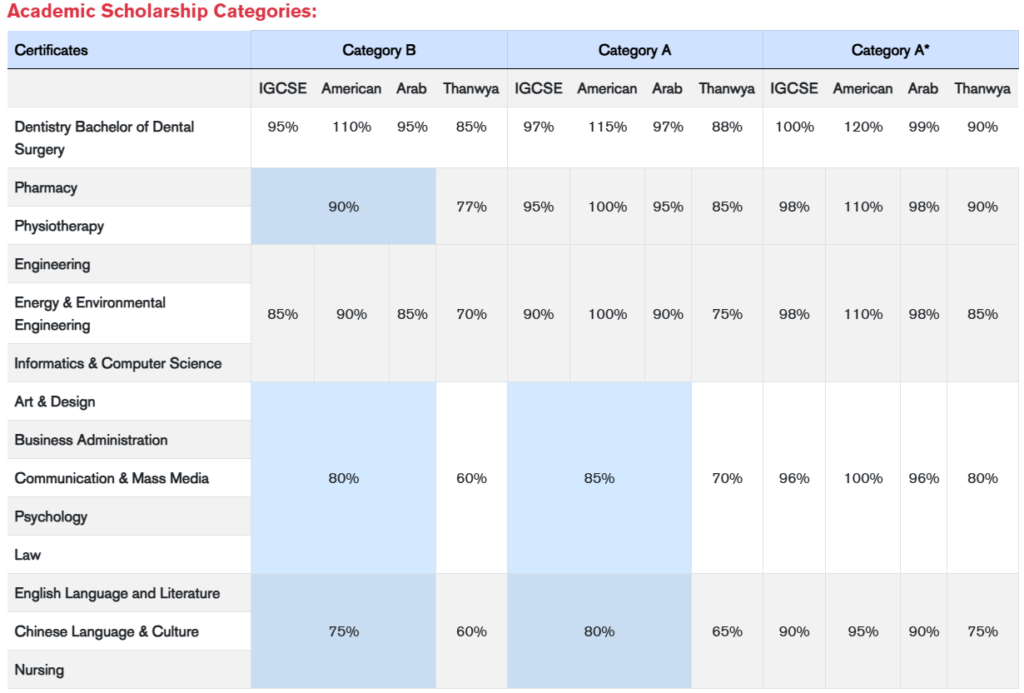 The partial scholarships criteria are offered in addition to the academic scholarships categories (A*-A-B-C) with a maximum of (20%) for all faculties except for Dentistry which is up to (15%). Exceptions apply for Sports achievements and deceased Guardian.
